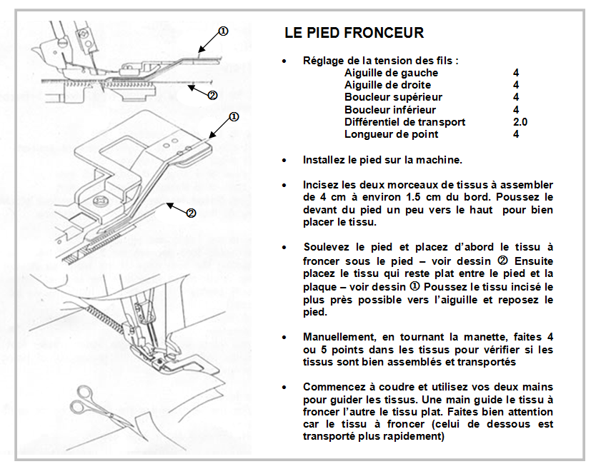 Le pied fronceur est disponible comme accessoire supplémentaire pour la plupart des surjeteuses. Voici, vous pouvez froncer une bande et la coudre sur un morceau de tissu en une seule opération. Le bord du tissu est fini simultanément. Il est également possible de froncer une seule couche de tissu.